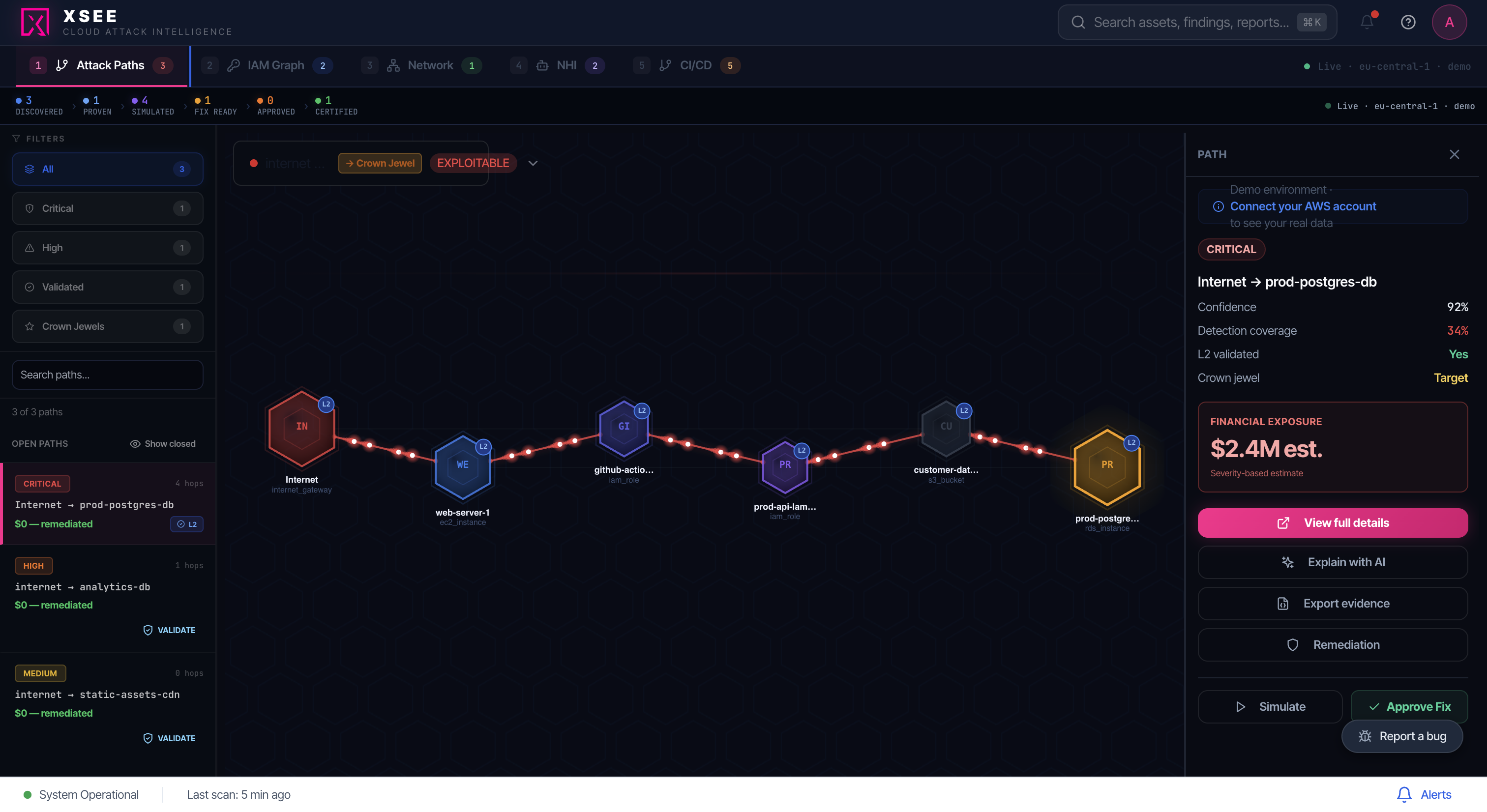 Any tool can show you an attack graph. Only XSEE can prove — hop by hop, API call by API call — that the path is real and exploitable right now.